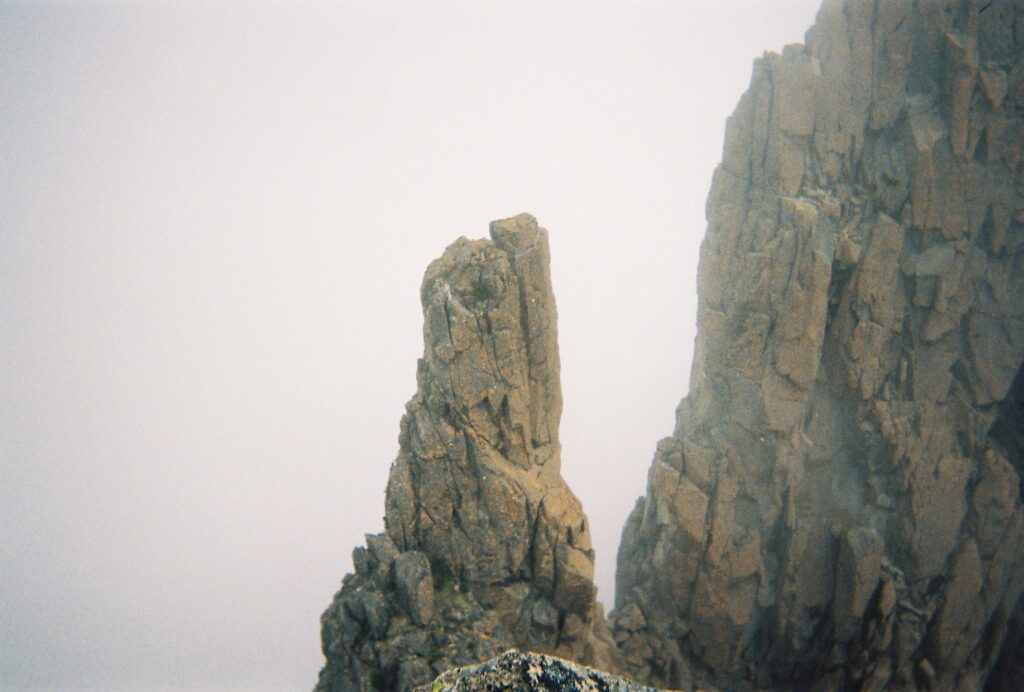 Rob offers generously to ascend the ropes to try and salvage things as I’m left stranded at the bail anchors. The ropes move exceedingly slowly as I reascend to the col and join him. The clouds slowly part during this time. A tiny score of blue sky is trying to poke through above.