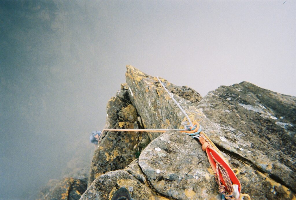 Massive exposure on the abseil but the ropes pull out OK, before a short abseil to the notch proper below the impressive ‘Foresight’.