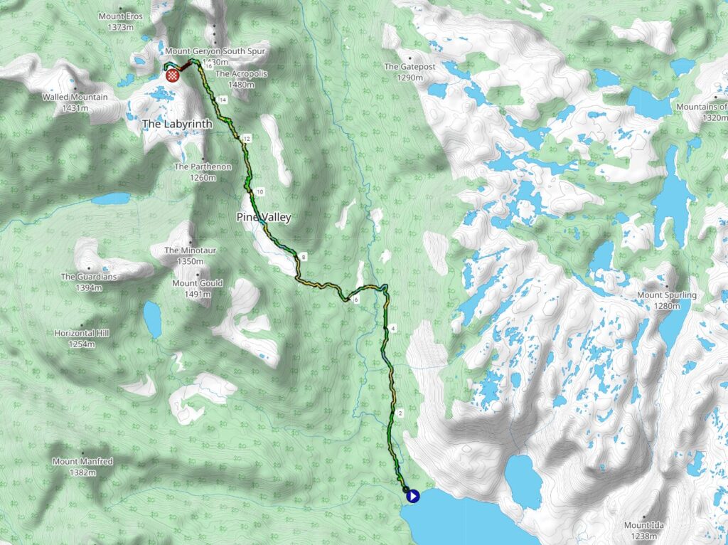 Hike in: We opted for the luxury of the ferry from Lake St Clair visitor centre to Narcissus hut and walked in the 17km to ‘the Labyrinthe’ to camp and fuel on cheap noodles. 573m elevation.