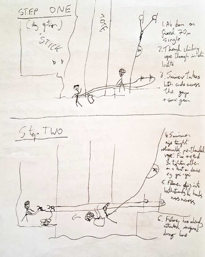 - 1st person having safely scaled the kelp, rigs a Tyrolean on this pre-threaded climbing rope, fixing one end to the bolted anchors and tensioning the other on either a hitch or device eg gri-gri