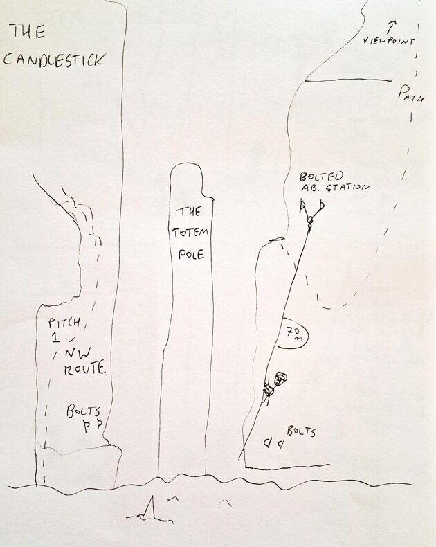 Once arrived, watered, changed, braced and ready for the mission. This rough guide is an option to follow for Tyrolean traverses. Covering the principles applied to the Candlestick here rather than every minute detail.