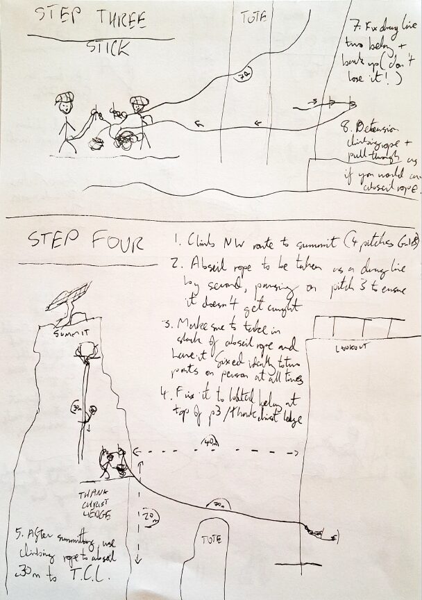 - Once shuffled over to the bolted belay at the ‘thank Christ’ ledge after pitch 3, fix the original abseil line to here at a couple of places and leave it there for later.