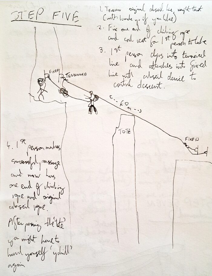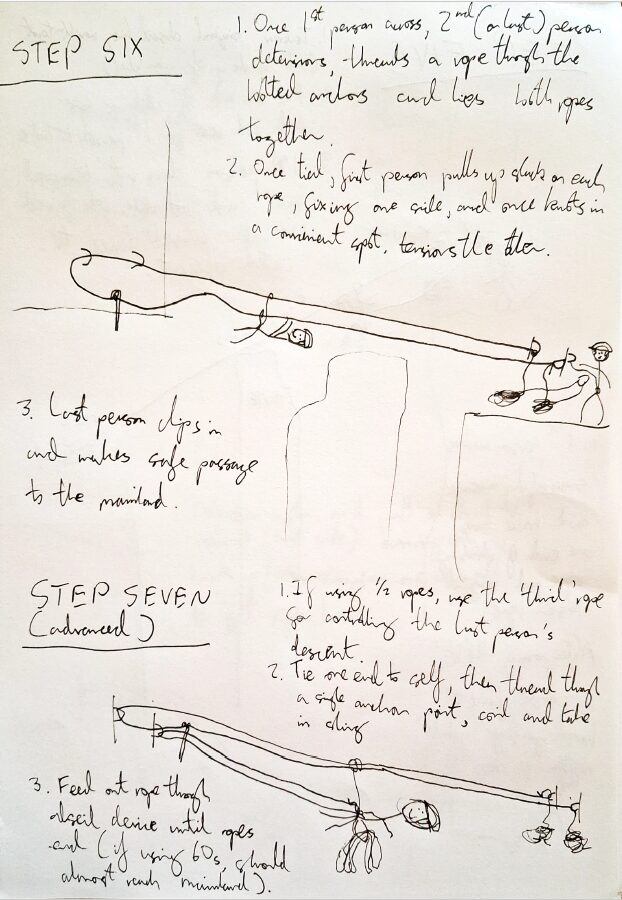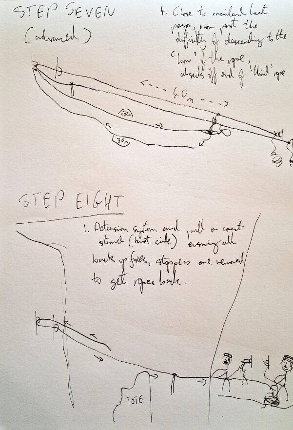 - 1st person makes successful passage to mainland feeding fixed climbing rope out controlling their descent. They now are on the mainland with both the end of the climbing rope and fixed end of the original abseil line.