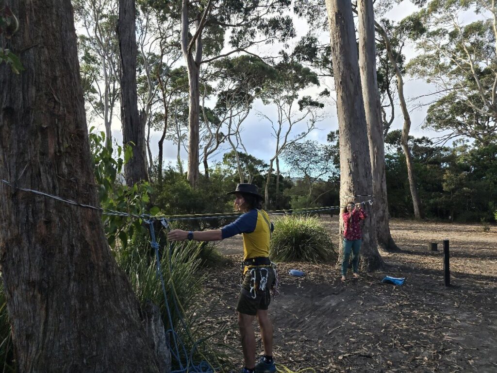 I recommend a dress rehearsal in Fortescue Bay campsite the night before by rigging a Tyrolean between two trees – use slings around trunks to simulate bolted belays. Strip if you want to simulate a swimmer. Practicing all steps and agreeing a suitable plan before the climb here is invaluable.